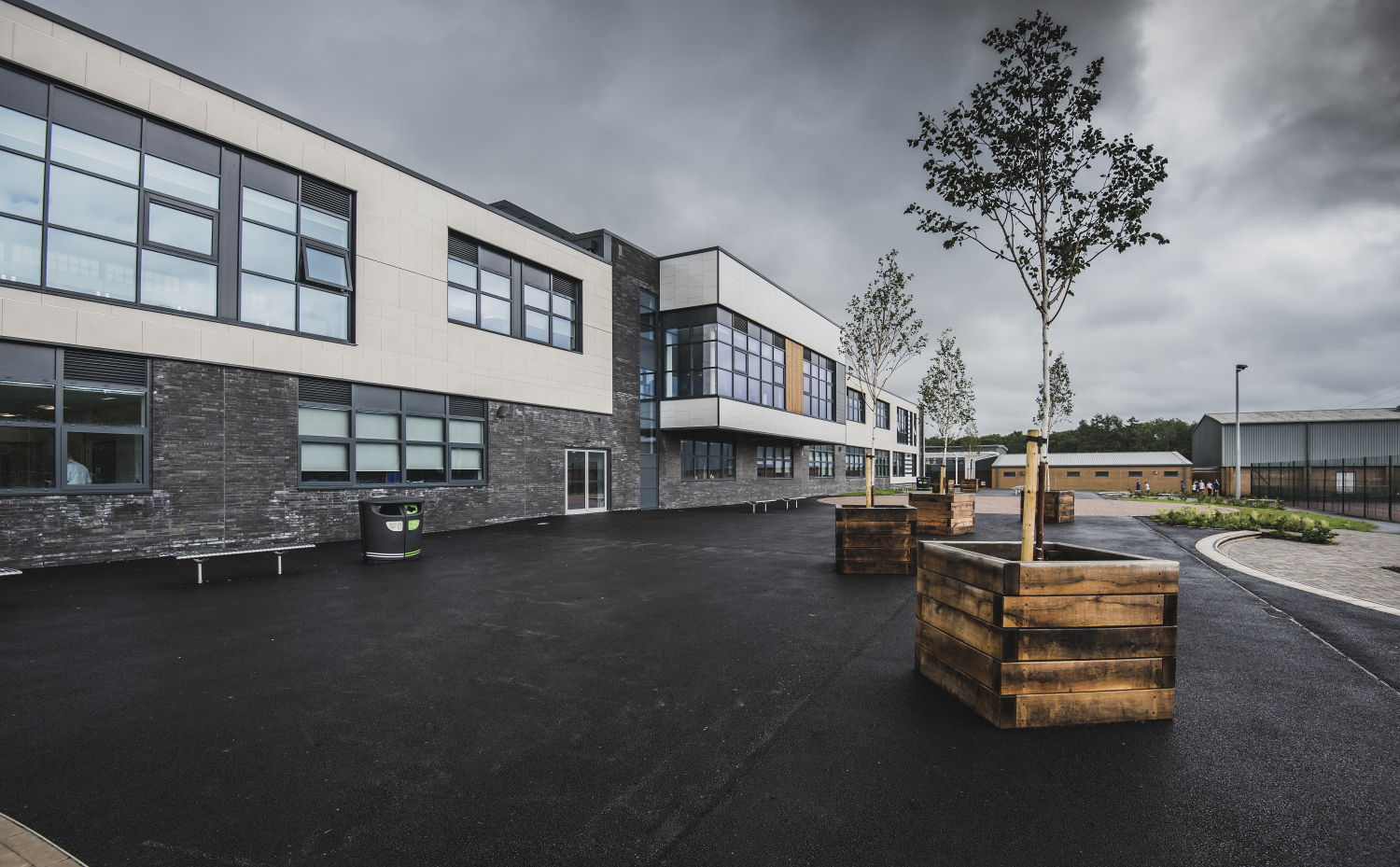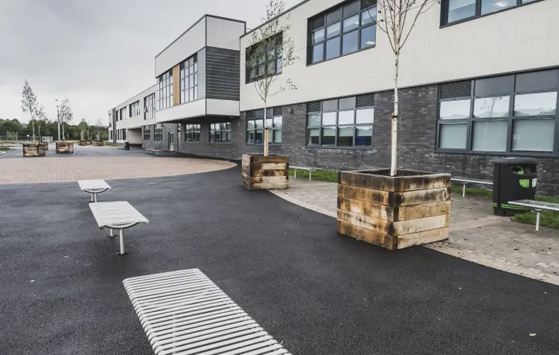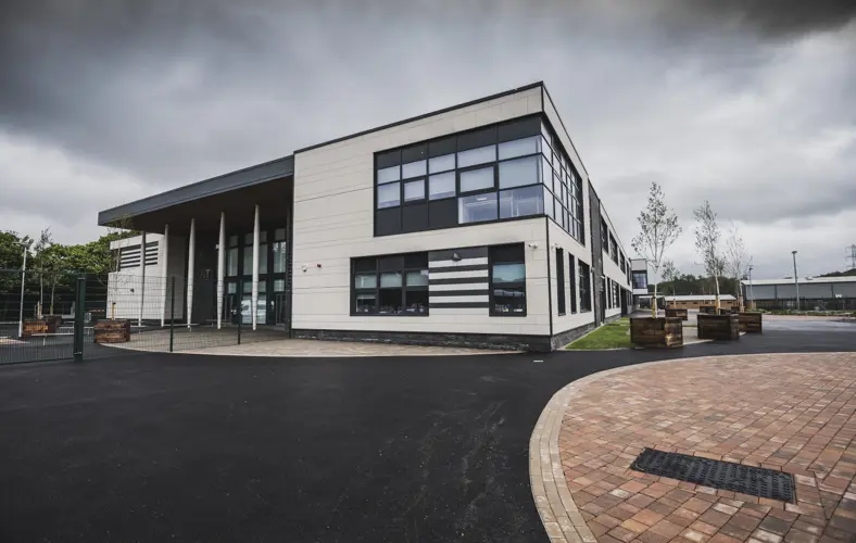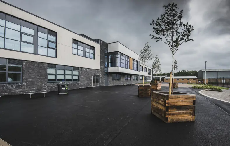 Working next to the existing school, which remained live throughout the scheme, the project comprised the construction of a new two-storey teaching facility, a 3G sports pitch to FIFA stage 1 recommendations, a new Multi Use Games Area, two grass football pitches, and a grass rugby pitch. The project also included the refurbishment of the existing drama and sports facilities – the only part of the existing campus that remained.